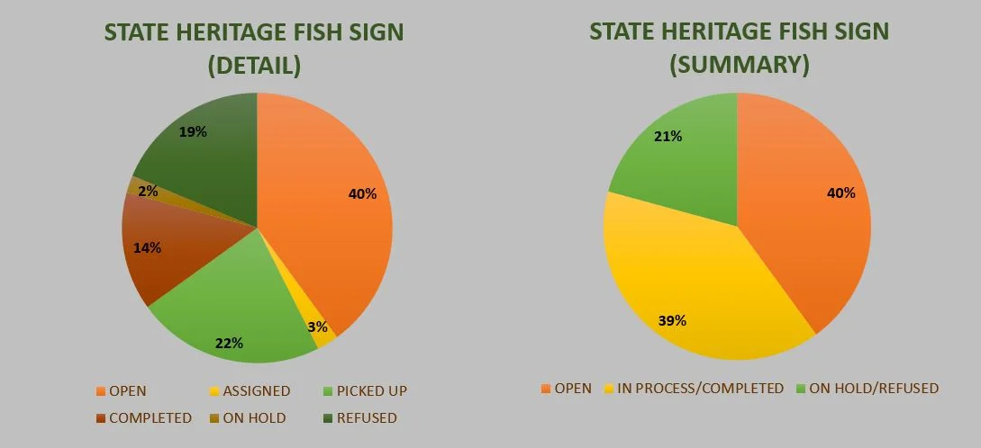 As you can see by the charts above signs have been posted on nearly 15% of the total State Heritage Fish waters. Another 25% have either been assigned or had their signs picked up for posting. This means that almost 40% of the waters are completed or in process.