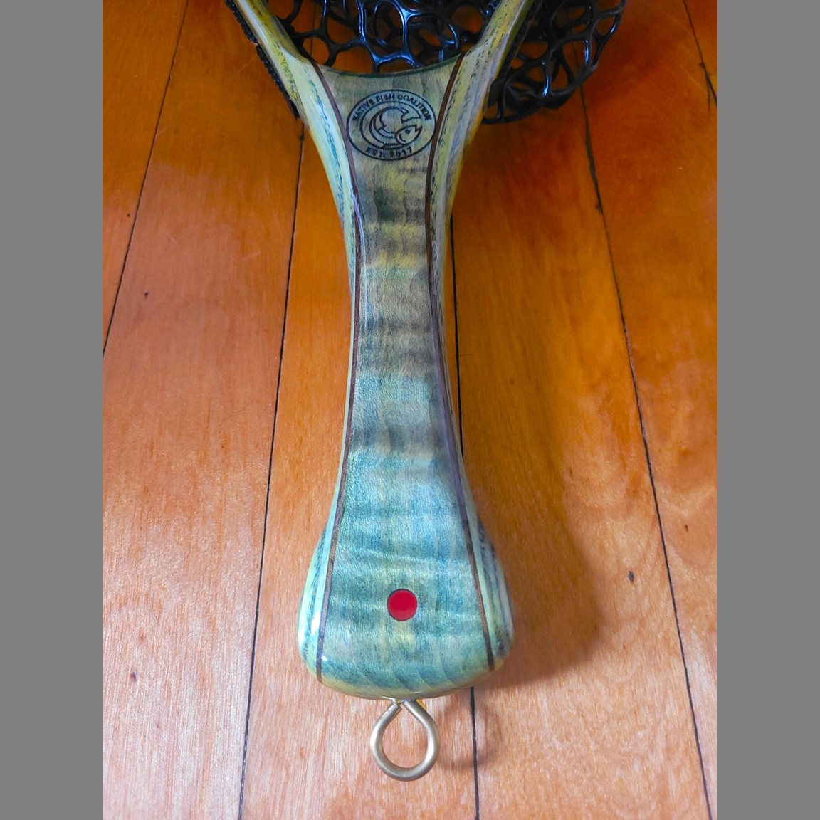 With an overall length of 20" and a hoop size of 12” by 9.5”, this net is ideal for stream bass. Features a fish-freindly black rubber bag, fixed o-ring in the handle for attaching a lanyard, and a vecro d-ring on the top of the hoop for hanging handle down. Green dyed wood with a burnt in NFC logo and inlaid red wood dot, or redeye, in the handle make this a one of a kind product. Made for NFC by New England Nets.