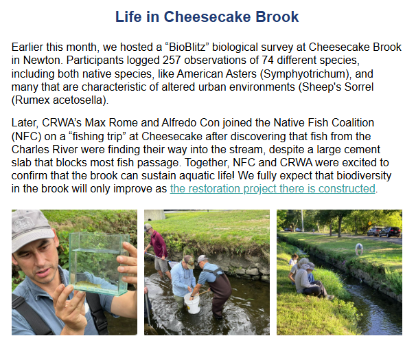 It’s great to be publicly recognized by your partners, especially when you are small and they are big :) That was the case recently when 60-year-old Charles River Watershed Association credited NFC in their newsletter for helping them confirm the presence of fish, including native species, in one of their previously believed to be fishless project streams…