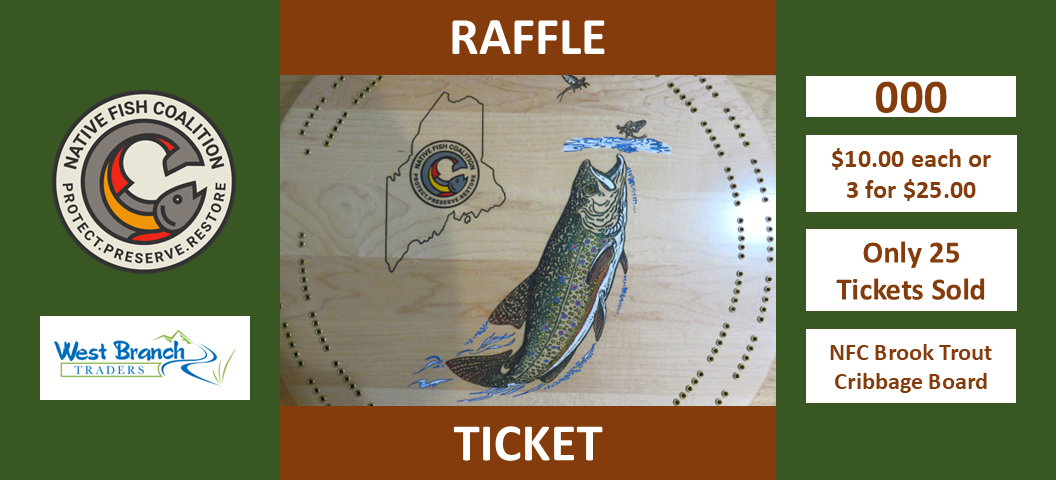 NFC is raffling off two wooden cribbage boards from West Branch Traders in Maine: Standard briook trout and NFC brook trout. These 17” cribbage boards come with a deck of cards and pins. Designed to hang on the wall when not in use. One ticket for $10 and 3 tickets for $25.