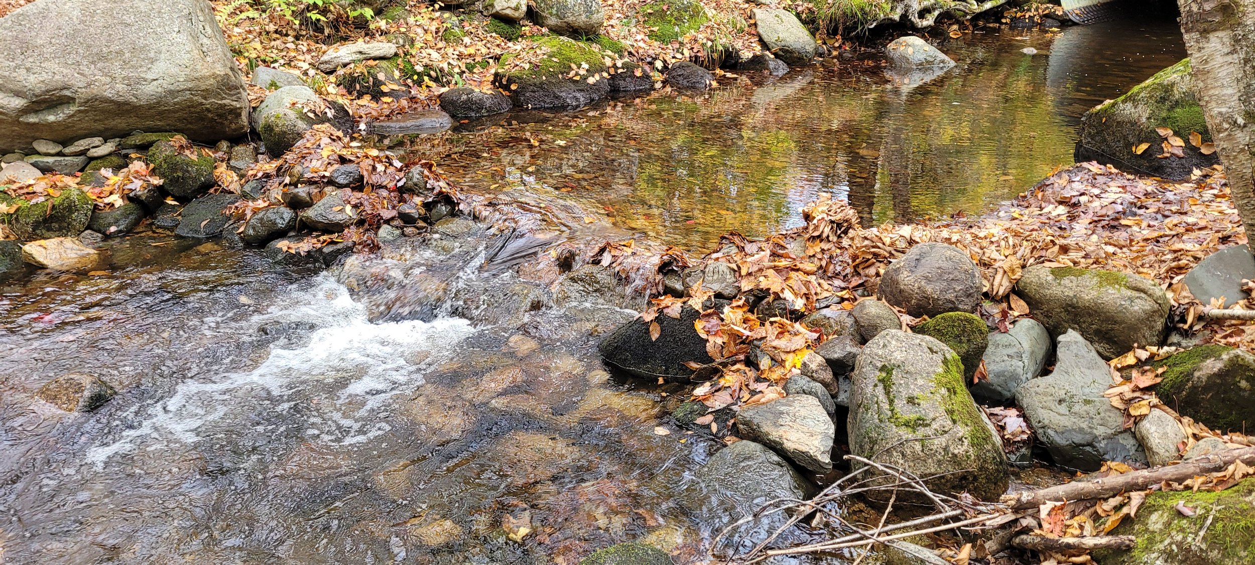 As fallen leaves collect on the top of the dam, and the water drops to fall levels, these manmade rock dams can block fish-passage. This is especially problematic in the fall as wild native brook trout are moving to spawn, as well as to find winter refuge.