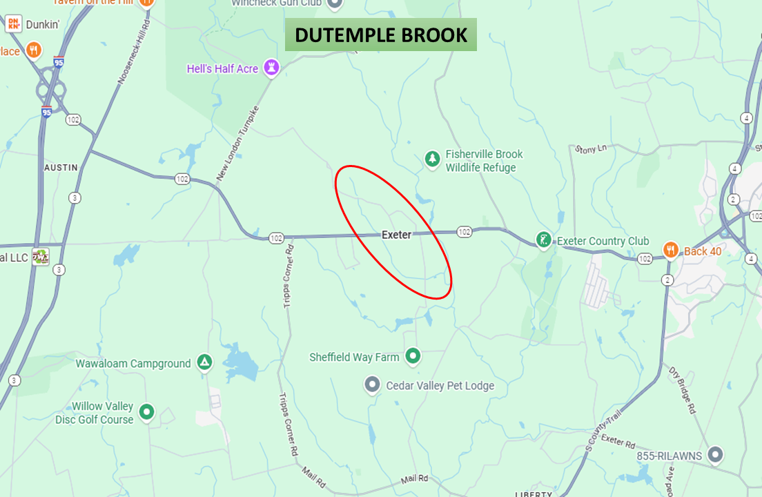Dutemple Brook is a 1.8 mile Class A coldwater stream with a 0.94 square mile drainage. It is part of the Wood-Pawcatuck Watershed. Dutemple Brook tributaries into Fisherville Brook which empties into Queen River. The Queen River terminates at Pawcatuck River.