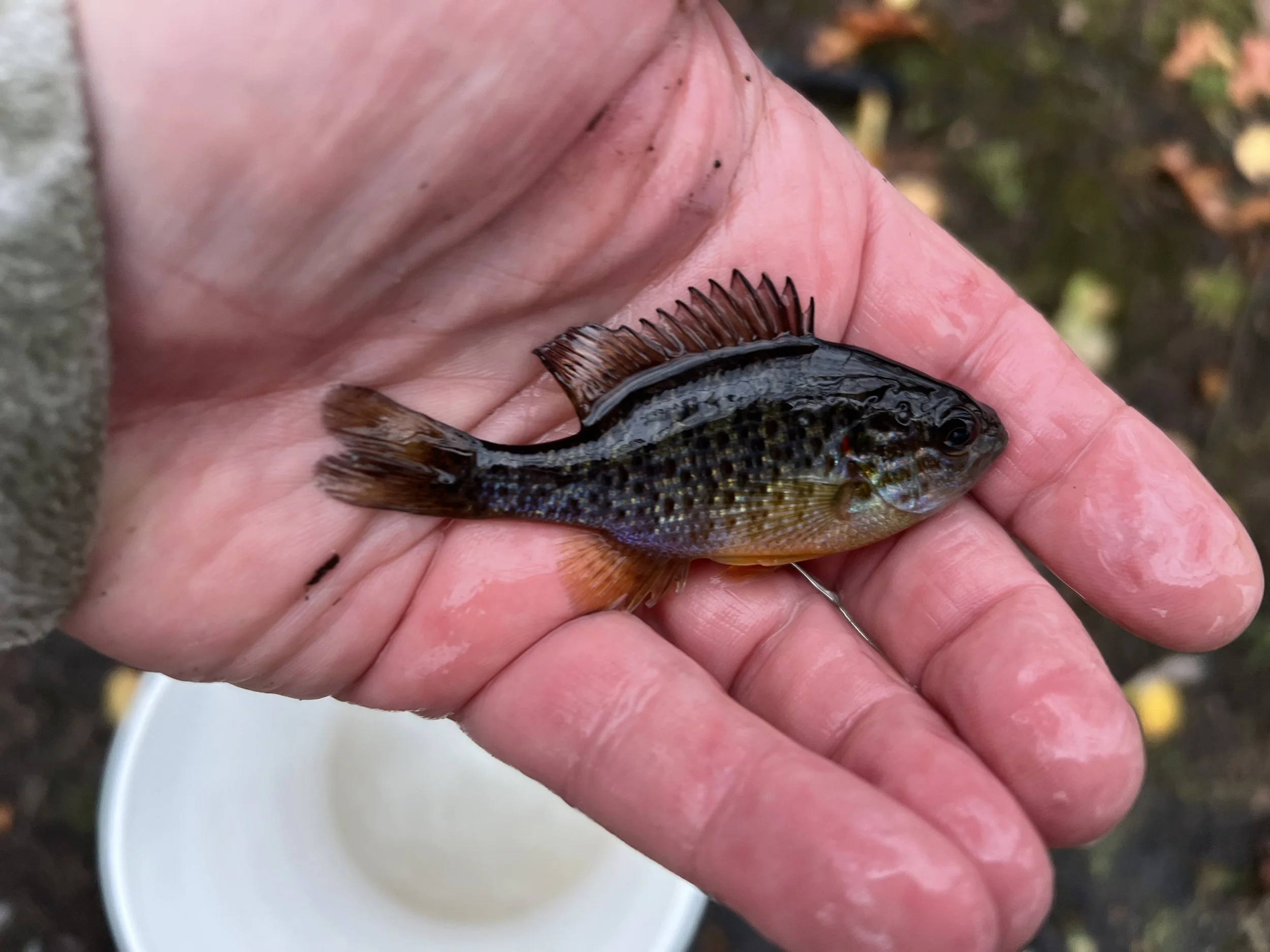 A wild native pumpkinseed sunfish, the only species of fish captured from Laundry Brook at Newton City Hall…