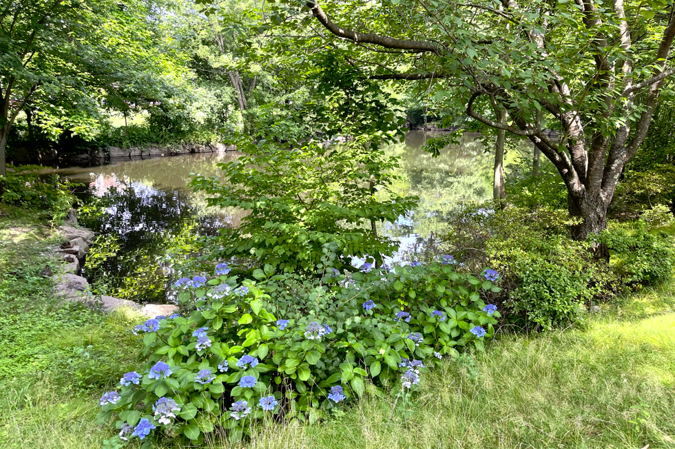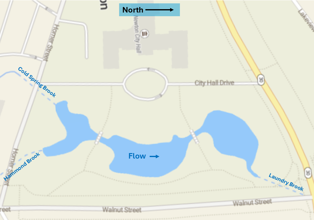 The section of Laundry Brook at Newton City Hall includes roughly an acre of impounded water before going underground and into Bullough’s Pond, which was originally called Spring Pond and later Pearl Lake. Bullough’s Pond, another manmade impoundment, was created in 1664 power a grist mill. This roughly 7 acre shallow impoundment was also used to harvest ice at one time.
