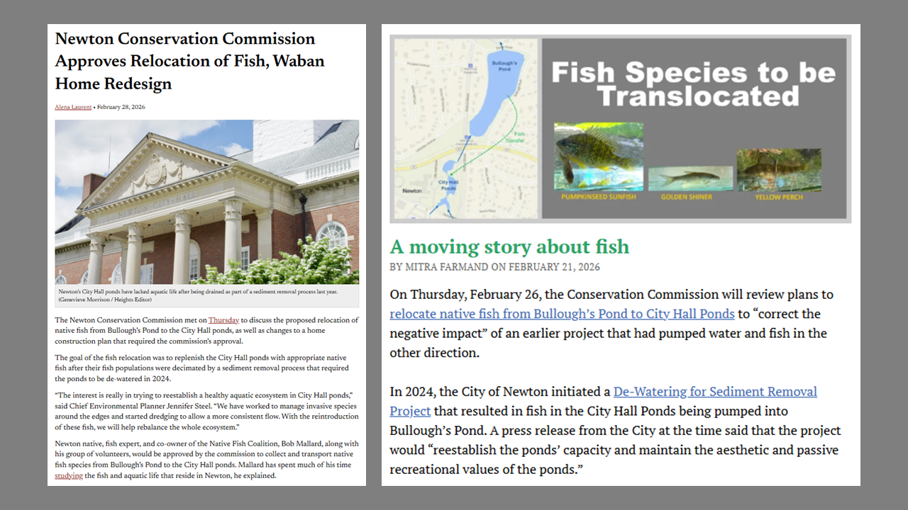 Soon after the MassWildlife permit was issued, NFC received unanimous subsequent approval from Newton Conservation Commission. We now have a tentative date of Saturday May 9th to execute the fish transfer between Bullough’s Pond and the Newton City Hall ponds weather permitting.