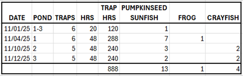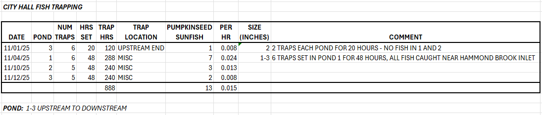 Unfortunately, both biodiversity and biomass are extremely low in Laundry Brook and Newton City Hall. NFC was only able to trap 13 fish in almost 900 hours of trapping. Only pumpkinseed sunfish, a species native to the Charles River watershed and abundant upstream were confirmed. And while not our focus, amphibian life seemed oddly low as well.