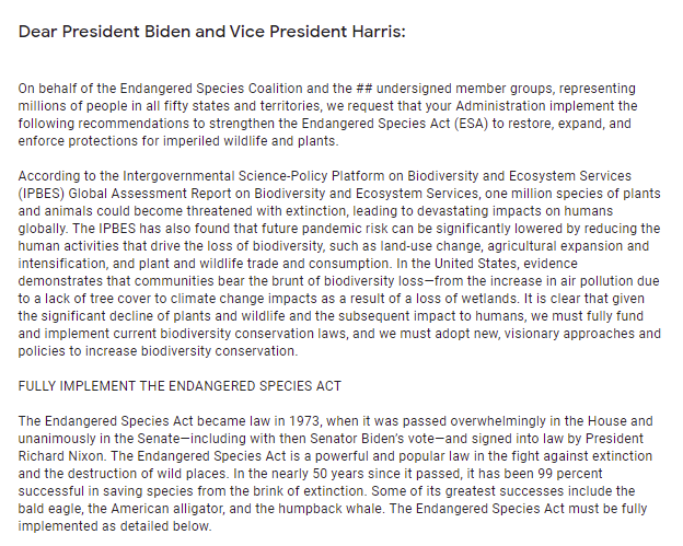 National NFC and all chapters signed onto a letter authored by the Endangered Species Coalition (ESC) that was sent to President Biden in support of the U.S. Endangered Species Act. ESC recently supported a legislative effort (LD883) involving Maine NFC to require the state-level listing of all federally-listed species found in Maine.