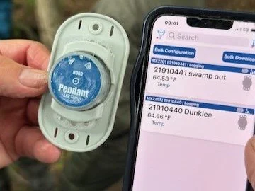 Note that while the loggers are Bluetooth compatible, they must be removed from the water to download the data. It is important that you secure the logger to the deployment apparatus in a manner that allows for easy removal and reinstallation. Please note and report the date/time of removal for future reference as it will appear as a spike or drop in water temperature.