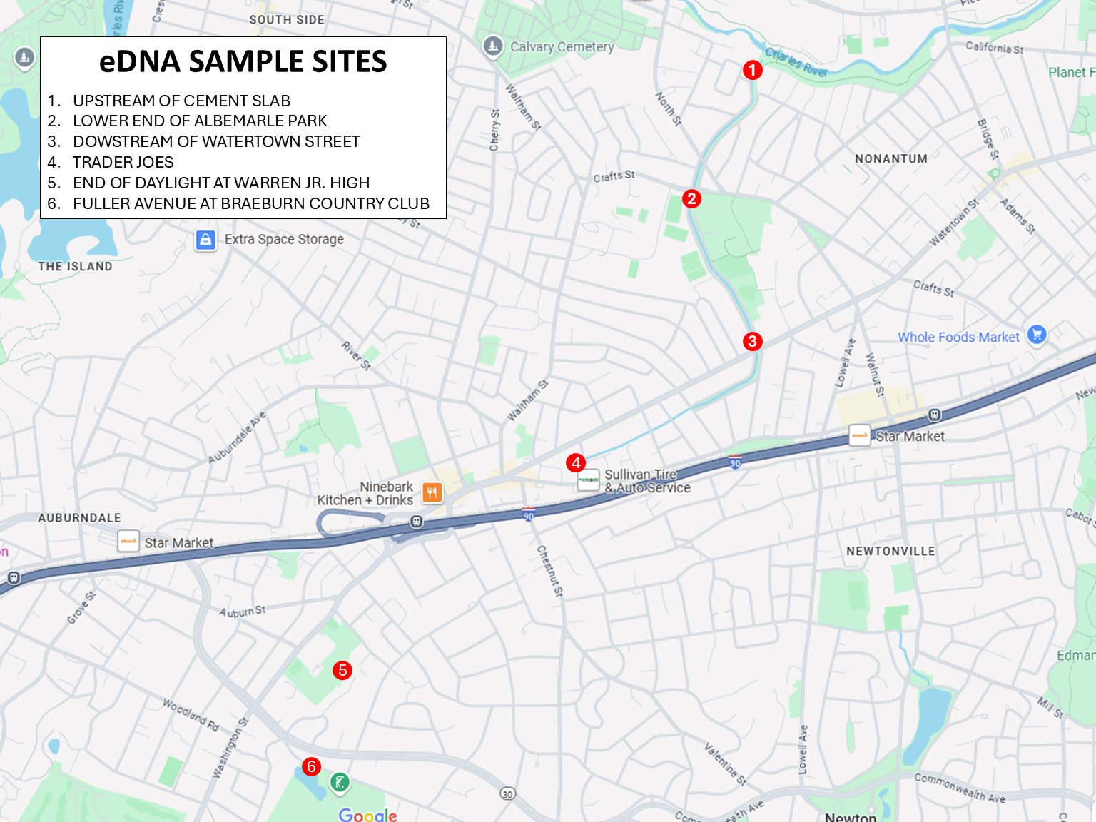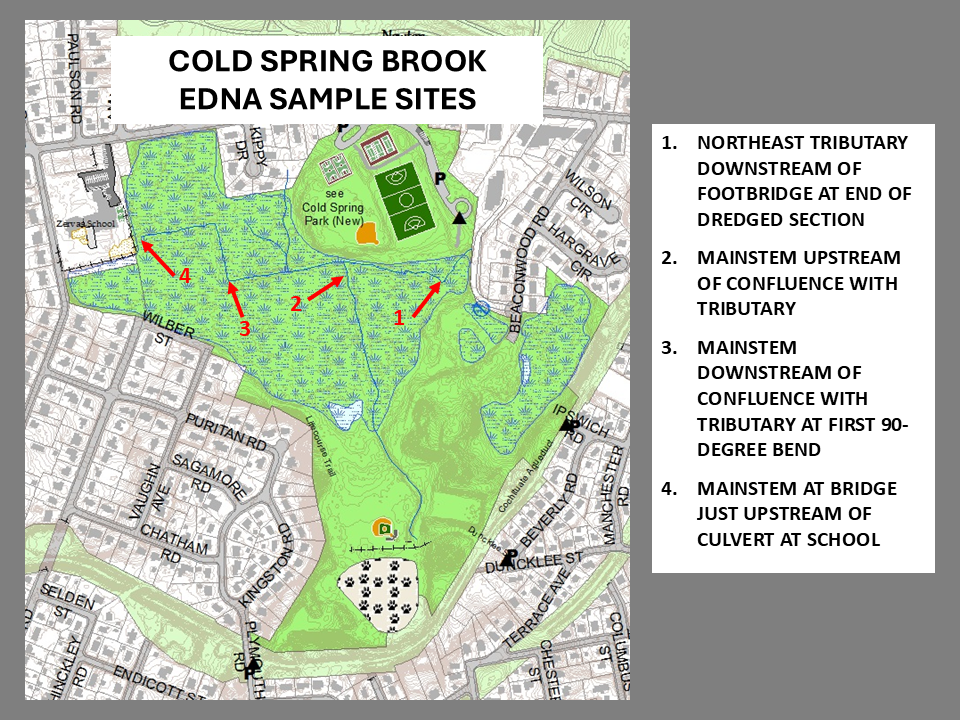 eDNA metabarcoding was used by Massachusetts NFC to determine what species of fish might be living in Cold Spring Brook in Cold Spring Park in Newton, MA.