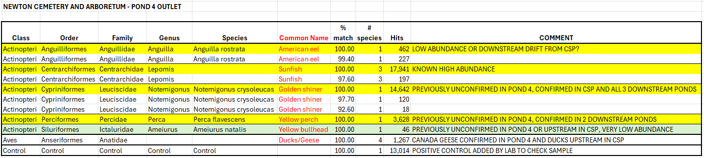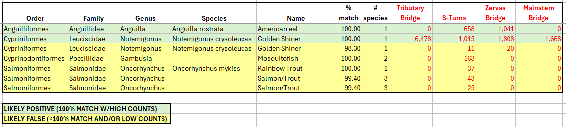 In addition to testing positive for golden shiners which NFC had already confirmed to be present, several samples tested positive for American eel, a species no one would have thought to look for. MA NFC used this data to direct e-fishing efforts which confirmed the presence of eels.
